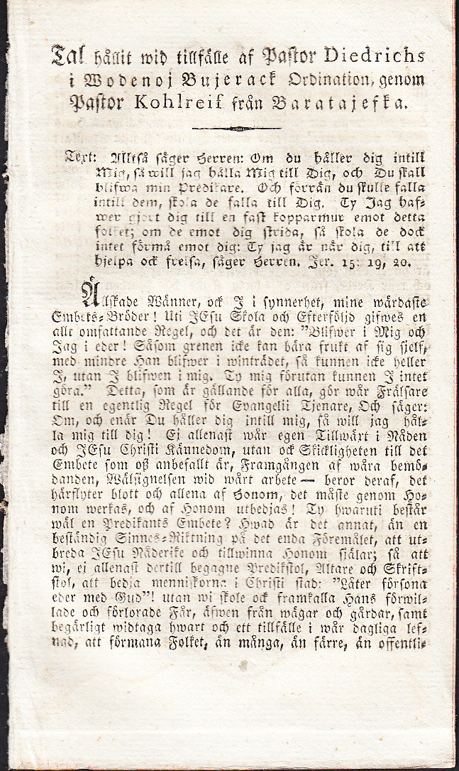 Tal hållit wid tillfälle af pastor Diedrichs i Wodenoj Bujerack ordination, genom pastor Kohlreif från Baratajeska [= rubrik].