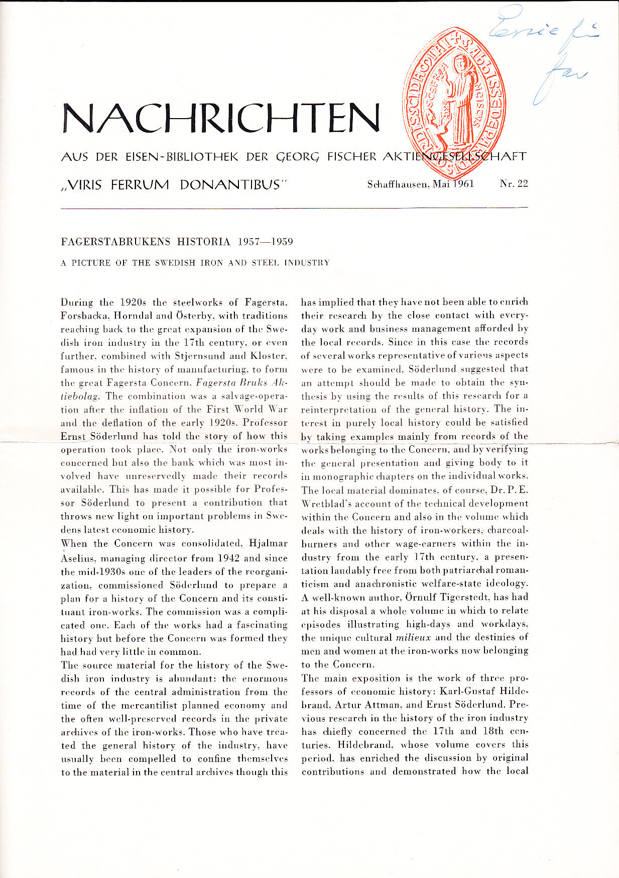 Meddelanden från Uppsala universitets geografiska institution. Ser. A:37. Nachrichten aus der eisen-bibliothek der Georg Fischer aktiengesellschaft. Mai 1961, Nr 22.