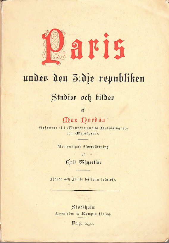 Paris under den 3:dje republiken. Studier och bilder af Max Nordau. Bemyndigad öfversättning af Erik Thyselius. Första häftet. [... Andra häftet; ... Tredje häftet; ... Fjärde och femte häftena (slutet)]. [Utg. av] Looström & Komp:s förlag.