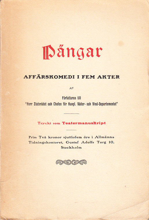 Pängar. Affärskomedi i fem akter, af författaren till ‘Herr statsrådet och chefen för Kungl. Väder- och vind-departementet’. Tryckt som teatermanuskript.