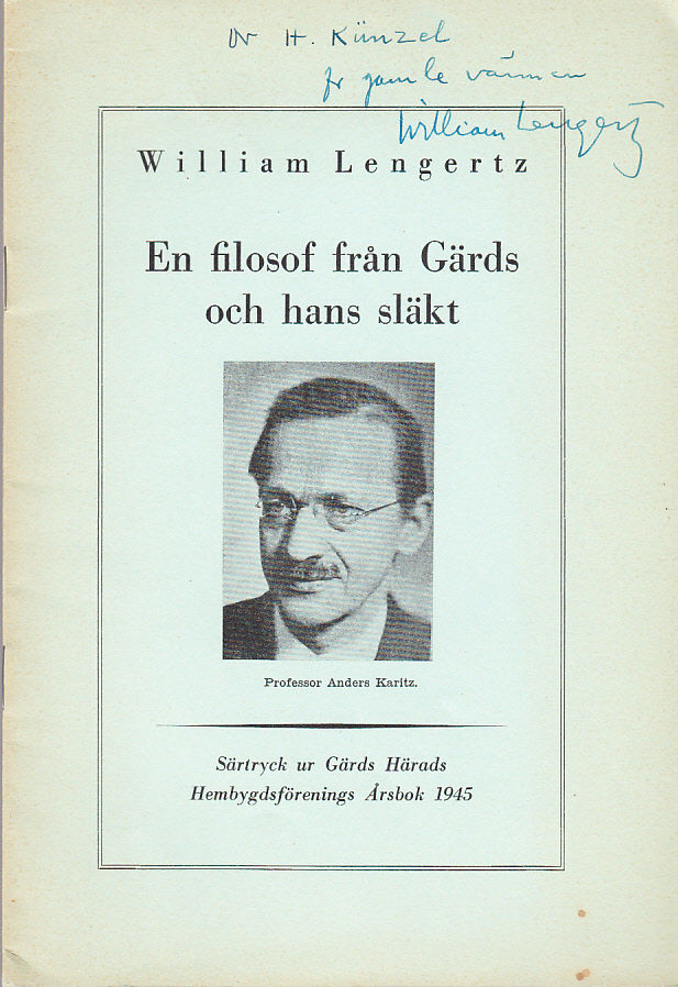 Malmö, Bröderna Forssells Boktryckeri, 1945. 8:o. 27, (1) s. Illustrerad. Klammerhäftad med styvt ljusgrönt illustrerat pappersomslag. Tillskrift ‘Dr H. Künzel fr gamla vännen William Lengertz’ på främre omslag.