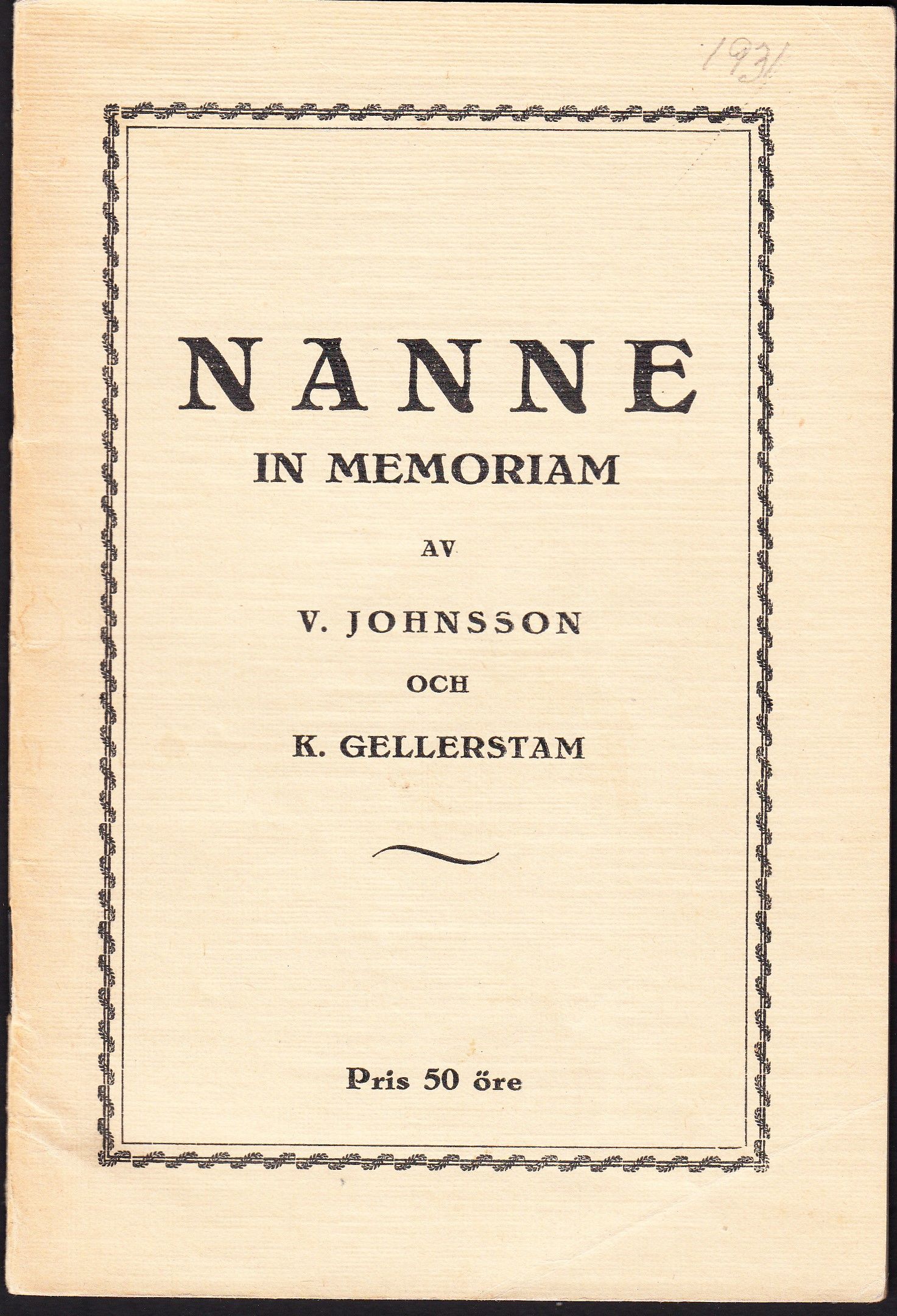 Endast tillgänglig i 1 Libris-bibliotek (KB). Andra (?) upplagan. Nya upplagor utgavs även 1975, 1976 & 1999. Omslagstitel ‘Nanne in memoriam av V. Johnsson och K. Gellerstam’. Innehåll: I. Minnesord av V. Johnsson ...; II. Predikan vid jordfästningen i Gällstads kyrka den 4 december 1930 av Knut Gellerstam ...
