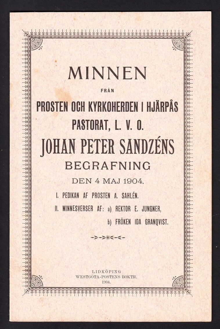 Minnen från prosten och kyrkoherden i Hjärpås pastorat, L. V. O. Johan Peter Sandzéns begrafning. Den 4 maj 1904. I. P[r]edikan af prosten A. Sahlén. II. Minnesverser af: a) Rektor E. Jungner, b) Fröken Ida Granqvist.