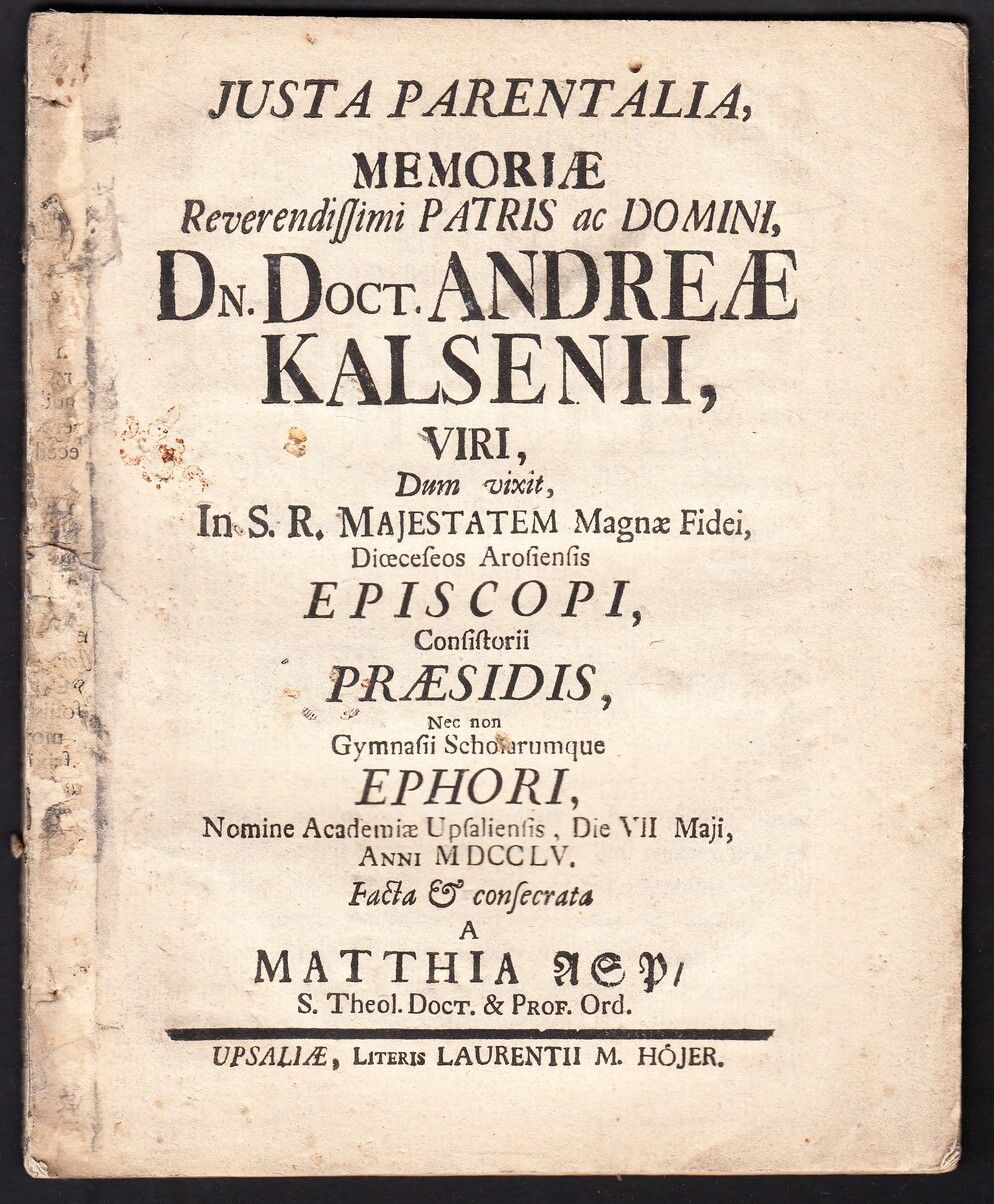 Justa parentalia, memoriæ reverendissimi patris ac domini, dn. doct. Andreæ Kalsenii, viri, dum vixit, in s.r. majestatem magnæ fidei, diœceseos Arosienis episcopi ... nomine academiæ Upsaliensis, die VII maji, anni MDCCLV. Facta & consecrata a Matthia Asp ...