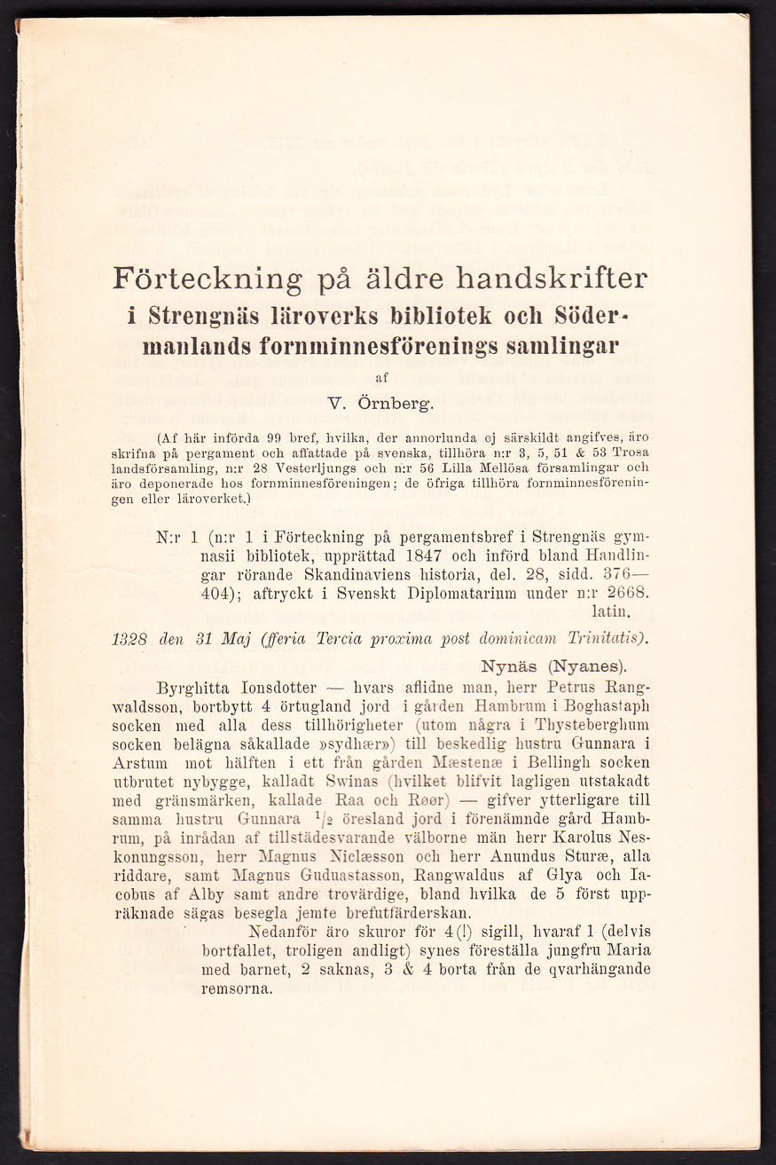 Förteckning på äldre handskrifter i Strengnäs läroverks bibliotek och Södermanlands fornminnesförenings samlingar af V. Örnberg. [= rubrik].