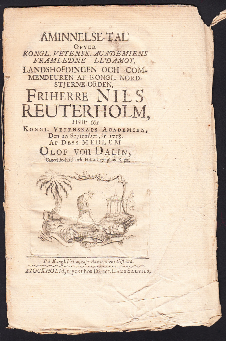Åminnelse-tal öfver Kongl. vetensk. academiens framledne ledamot, landshöfdingen ... Nils Reuterholm, hållit för kongl. vetenskaps academien, den 20 september, år 1758. Af dess medlem Olof von Dalin ... På Kongl. vetenskaps academiens tilstånd.