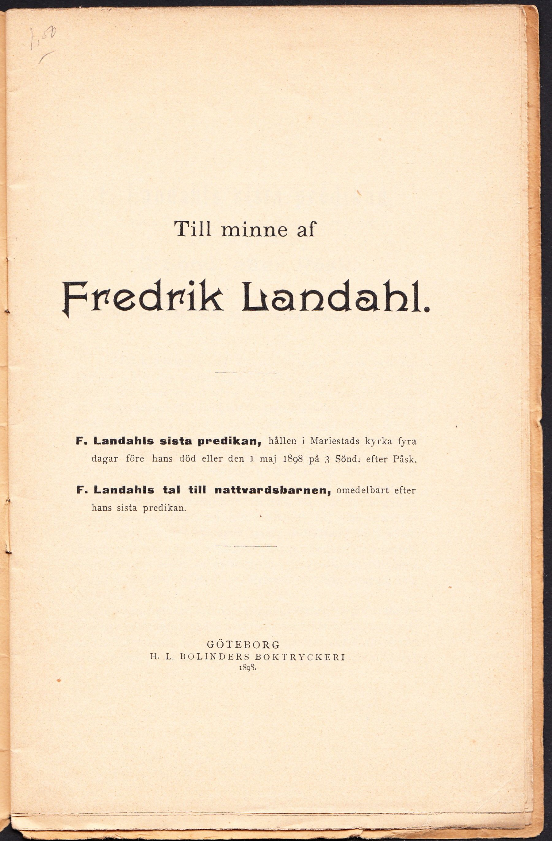 Till minne af Fredrik Landahl. F. Landahls sista predikan, hållen i Mariestads kyrka fyra dagar före hans död den 1 maj 1898 på 3:e sönd. efter Påsk. F. Landahls tal till nattvardsbarnen, omedelbart efter hans sista predikan.
