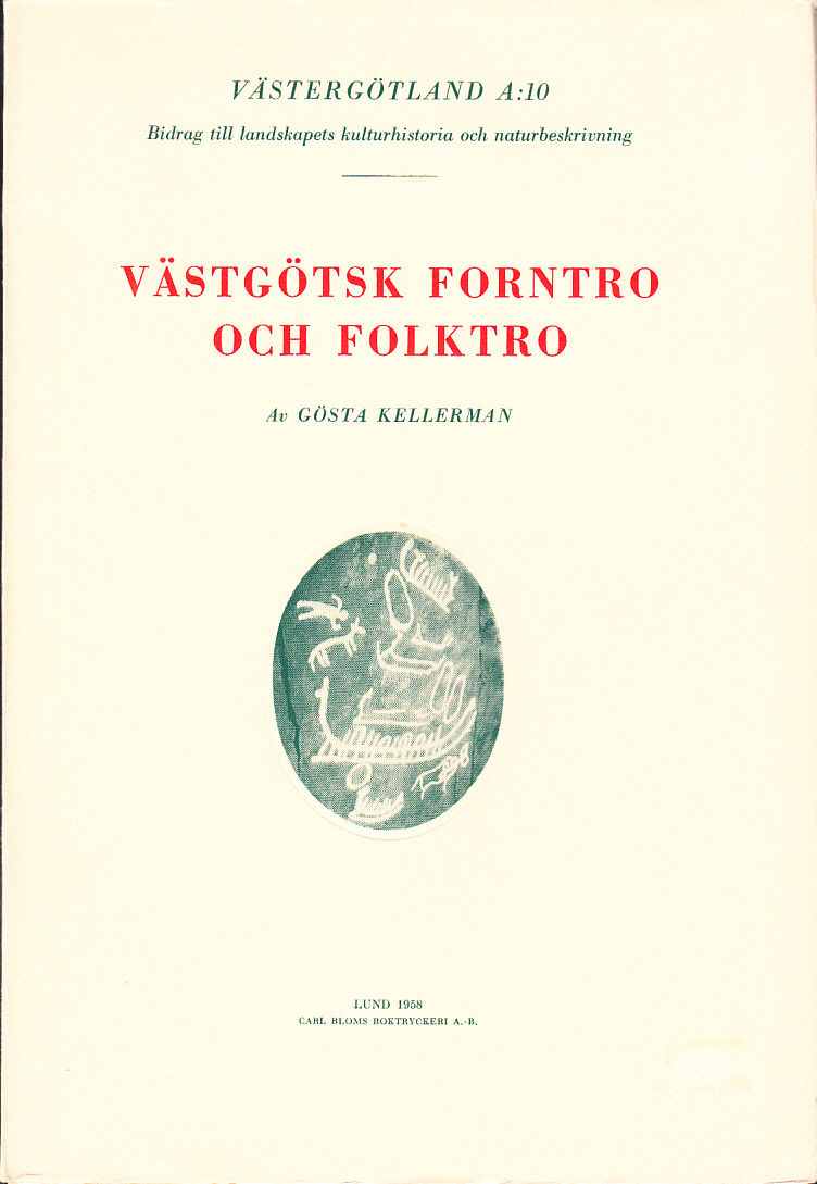 Västergötland A:10. Bidrag till landskapets kulturhistoria och naturbeskrivning. Omslagstitel ‘Västgötsk forntro och folktro’. Innehåll: Västgötska kulturförbindelser; Forntidens kulturepoker; Förkristen tro och sed (Fångskulturen och jordbrukskulturens tänkesätt; Vattnet och dess makter; Skogen och dess makter; Bergens, markens och gårdens makter; Eldkult; Jordbrukets fruktbarhetskult och jordbruksårets högtider; Himmelens makter; Gudakult (Tor; Oden; Ull; Frigg; Frö, Fröja och Njord); Livets högtider (Barnets födelse; Frieri och bröllop; Sjukdom, död och begravning)); Efterskrift; Använda förkortningar; Innehållsförteckning.
