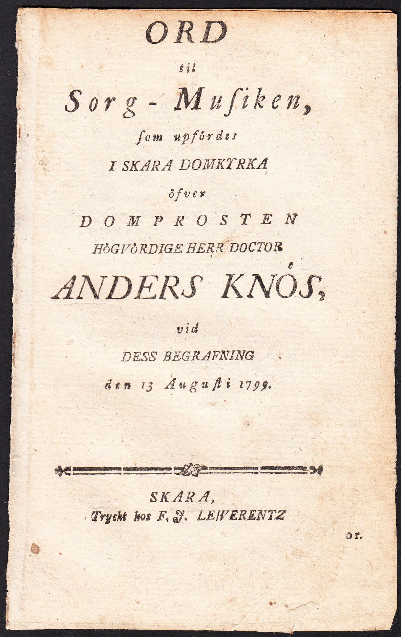 Ord til sorg-musiken, som upfördes i Skara domkyrka öfver domprosten högvördige herr doctor Anders Knös, vid dess begrafning den 13 augusti 1799.