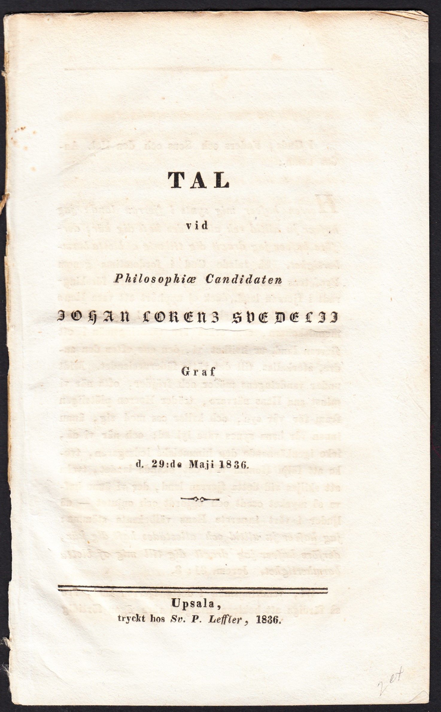 Tal vid philosophiæ candidaten Johan Lorenz Svedelii graf d. 29 maji 1836.