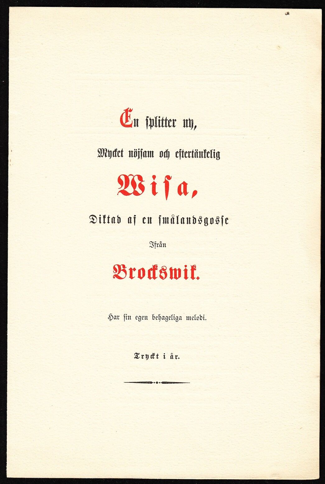 En splitter ny, mycket nöjsam och eftertänkelig Wisa, diktad af en smålandsgosse från Brocksvik. Har sin egen behageliga melodi. Tryckt i år. [Utg. av Nordiska museet].