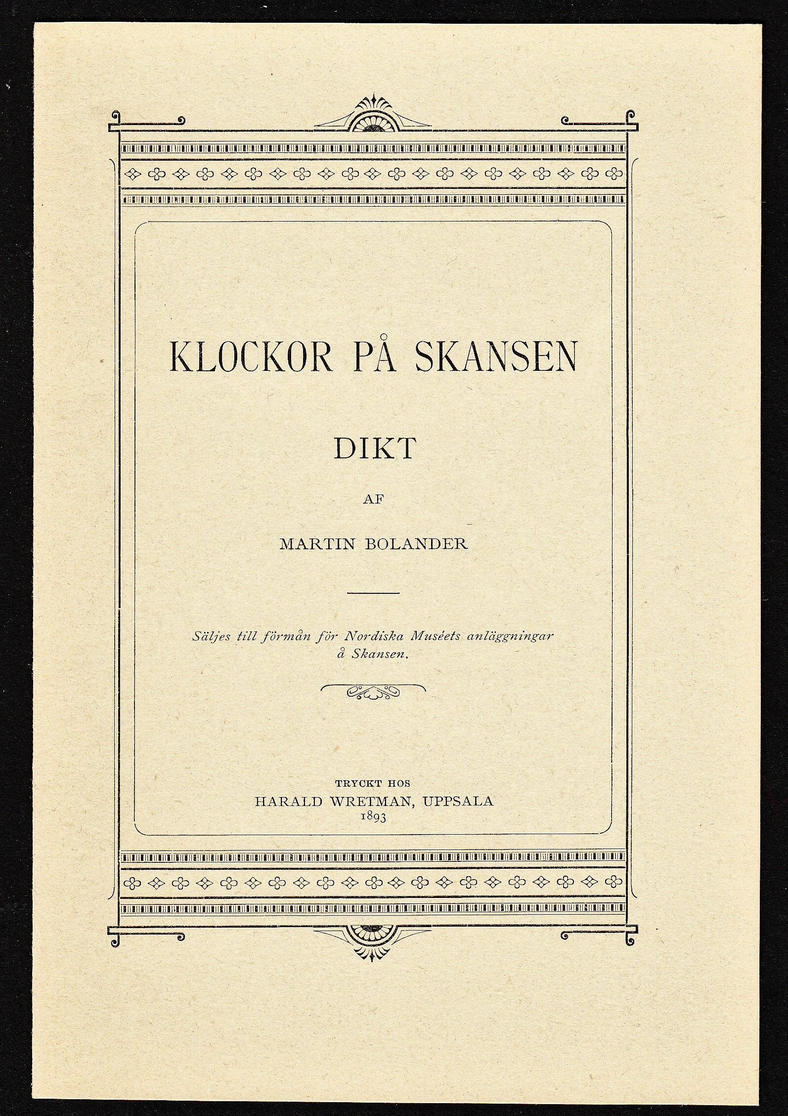 Klockor på Skansen. Dikt af Martin Bolander. [Utg. av Nordiska museet].