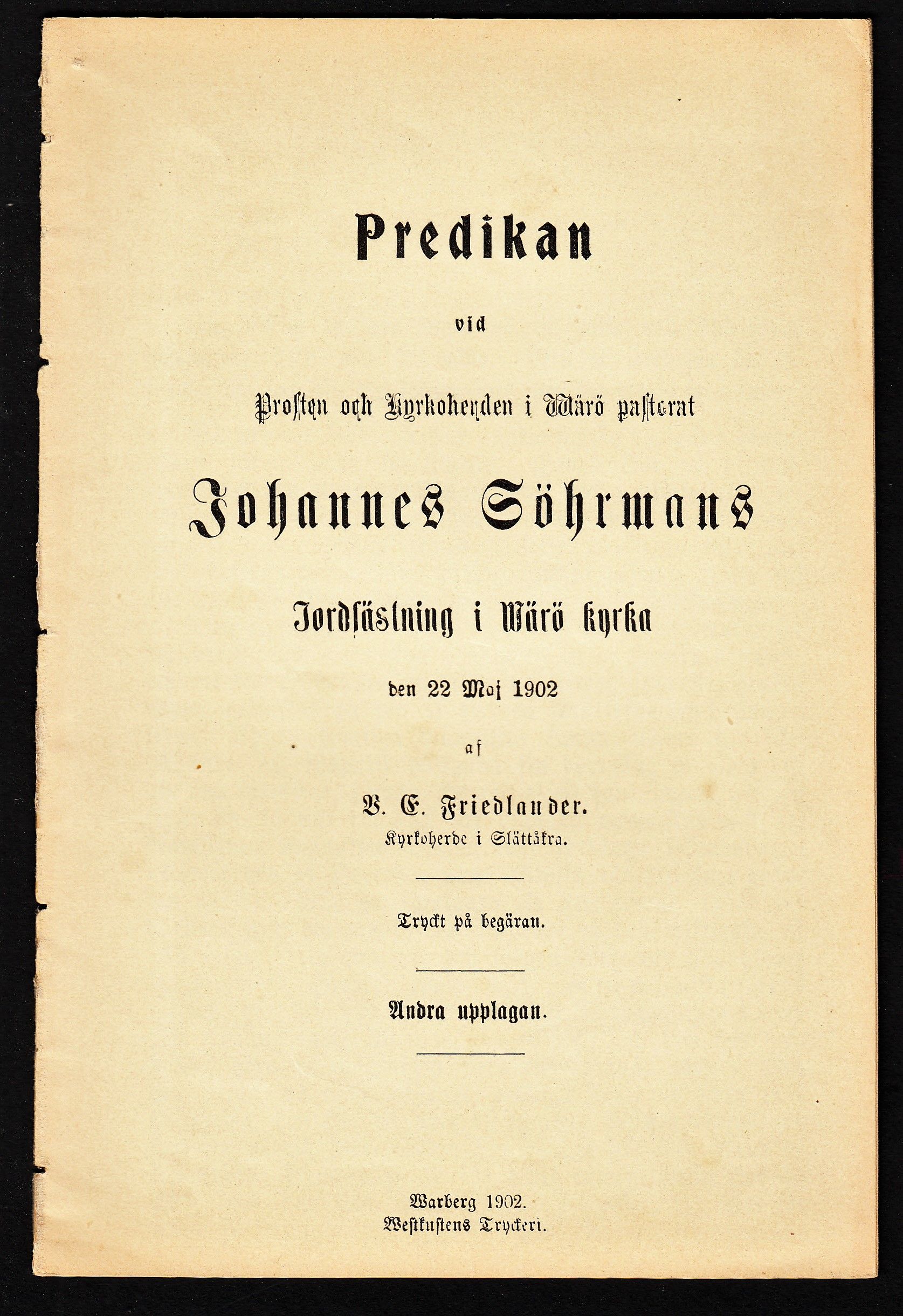 Predikan vid prosten och kyrkoherden i Wärö pastorat Johannes Söhrmans jordfästning i Wärö kyrka den 22 maj 1902 af V.E. Friedlander ... Tryckt på begäran. Andra upplagan.