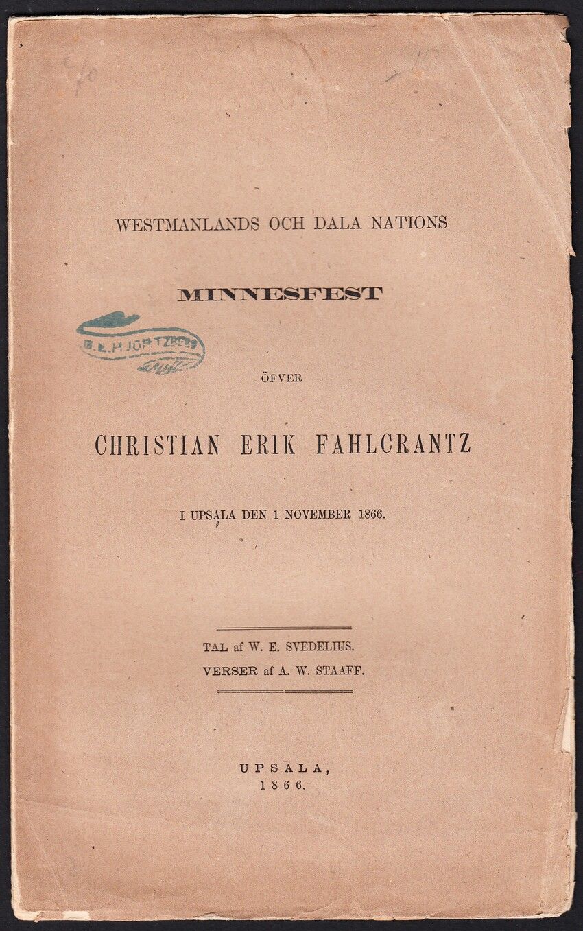 Westmanlands och Dala nations minnesfest öfver Christian Erik Fahlcrantz i Upsala den 1 november 1866. Tal af W. E. Svedelius. Verser af A. W. Staaff.