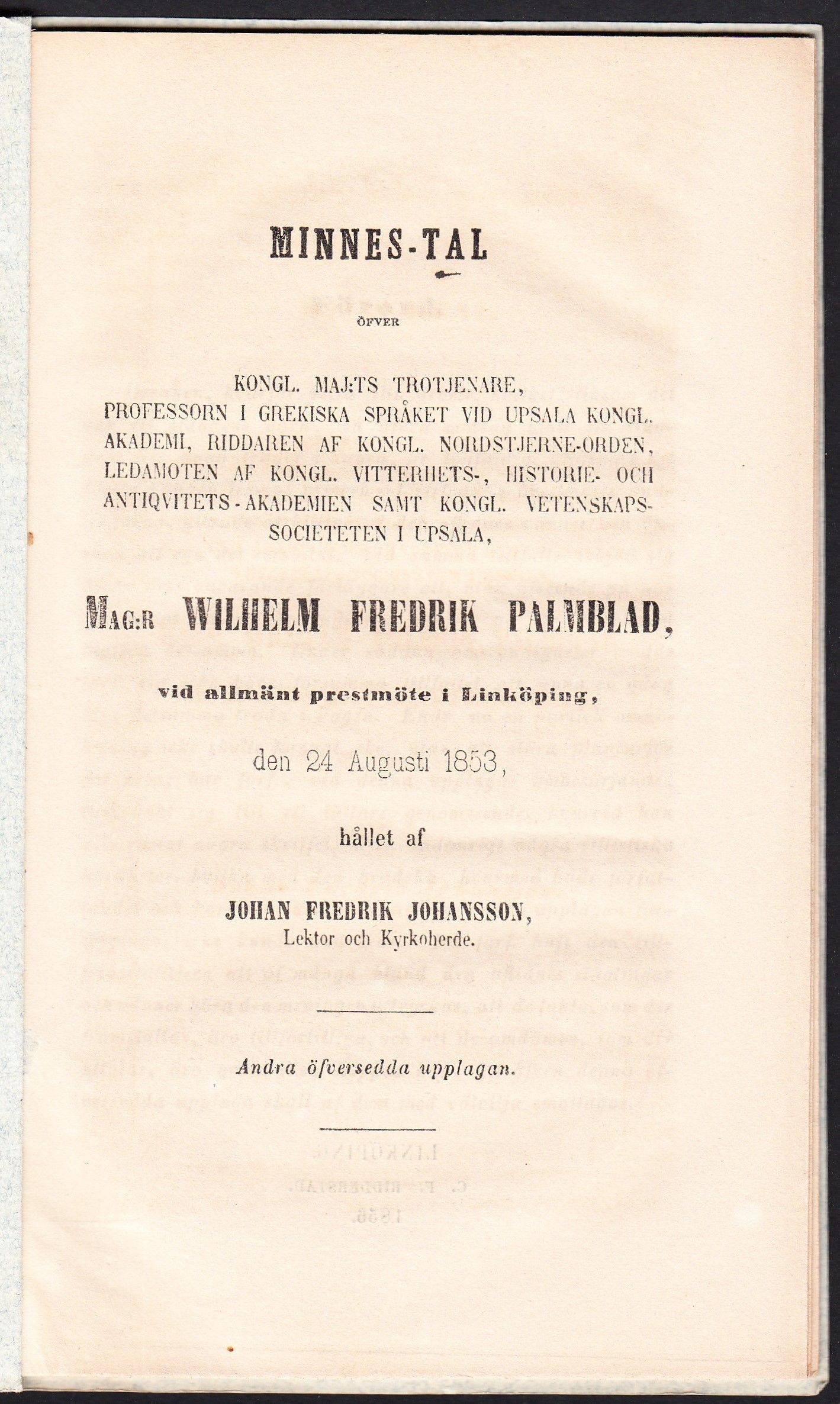 Minnes-tal öfver kongl. maj:ts trotjenare, professorn i grekiska språket vid Upsala Kongl. akademi, riddaren af kongl. Nordstjerne-orden, ledamoten af Kongl. Vitterhets-, historie- och antiquitets-akademien samt Kongl. Vetenskaps-societeten i Upsala, mag:r Wilhelm Fredrik Palmblad, vid allmänt prestmöte i Linköping, den 24 augusti 1853, hållet af Johan Fredrik Johansson ... Andra öfversedda upplagan.