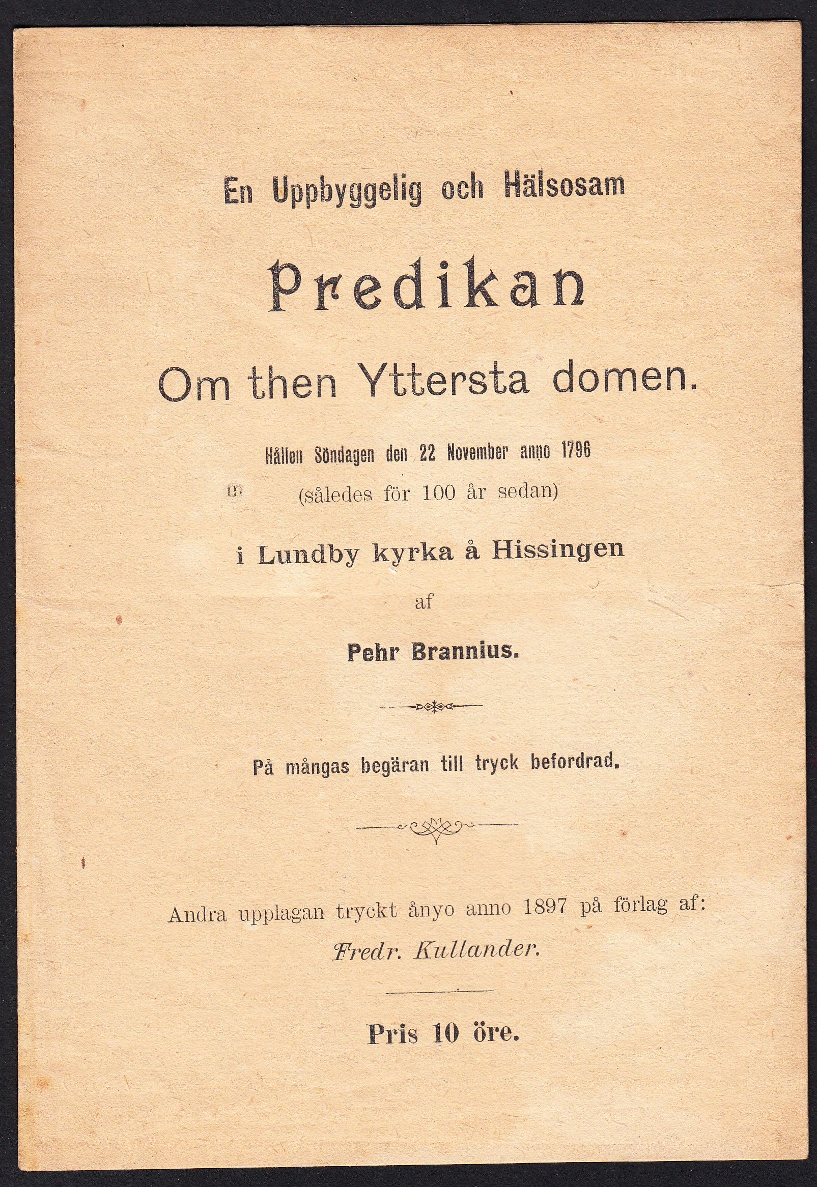 En uppbyggelig och hälsosam predikan om then yttersta domen. Hållen söndagen den 22 november anno 1796 (således för 100 år sedan) i Lundby kyrka å Hissingen af Pehr Brannius. På mångas begäran till tryck befordrad. Andra upplagan tryckt ånyo anno 1897 på förlag af: Fredr. Kullander.