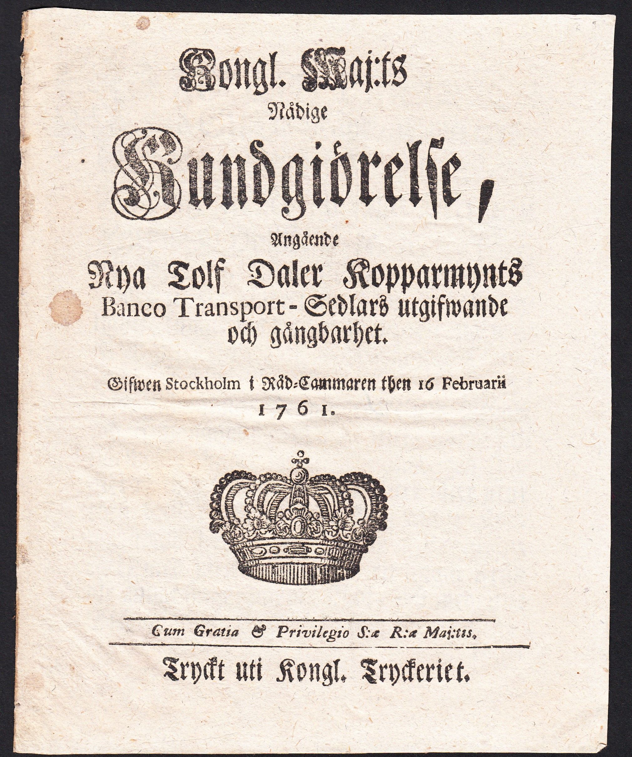 Kongl. Maj:ts Nådige Kundgiörelse, Angående Nya Tolf Daler Kopparmynts Banco Transport-Sedlars utgifwande och gångbarhet. Gifwen Stockholm i Råd-Cammaren then 16 Februarii 1761.