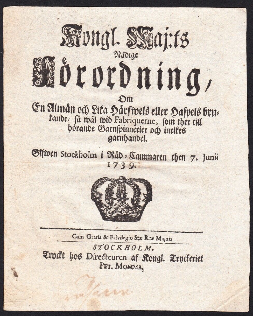 Kongl. Maj:ts Nådige Förordning, Om En Almän och Lika Härfwels eller Haspels brukande, så wäl wid Fabriquerne, som ther till hörande Garnspinnerier och inrikes garnhandel. Gifwen Stockholm i Råd-Cammaren then 7. Junii 1739.