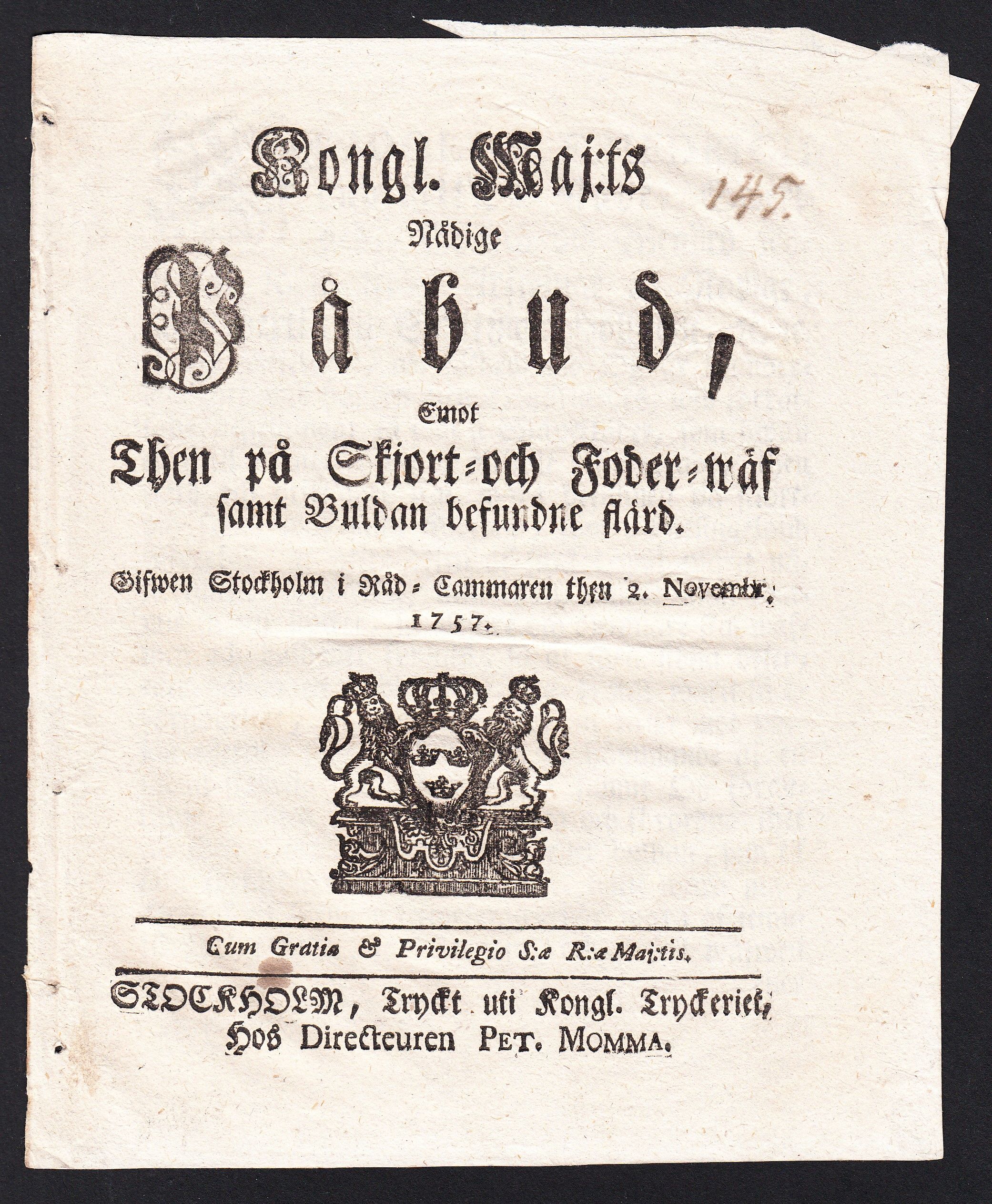 Kongl. maj:ts nådige Påbud, Emot Then på Skjort- och Foder-wäf samt Buldan befundne flärd. Gifwen Stockholm i Råd-Cammaren then 2. novembr. 1757.