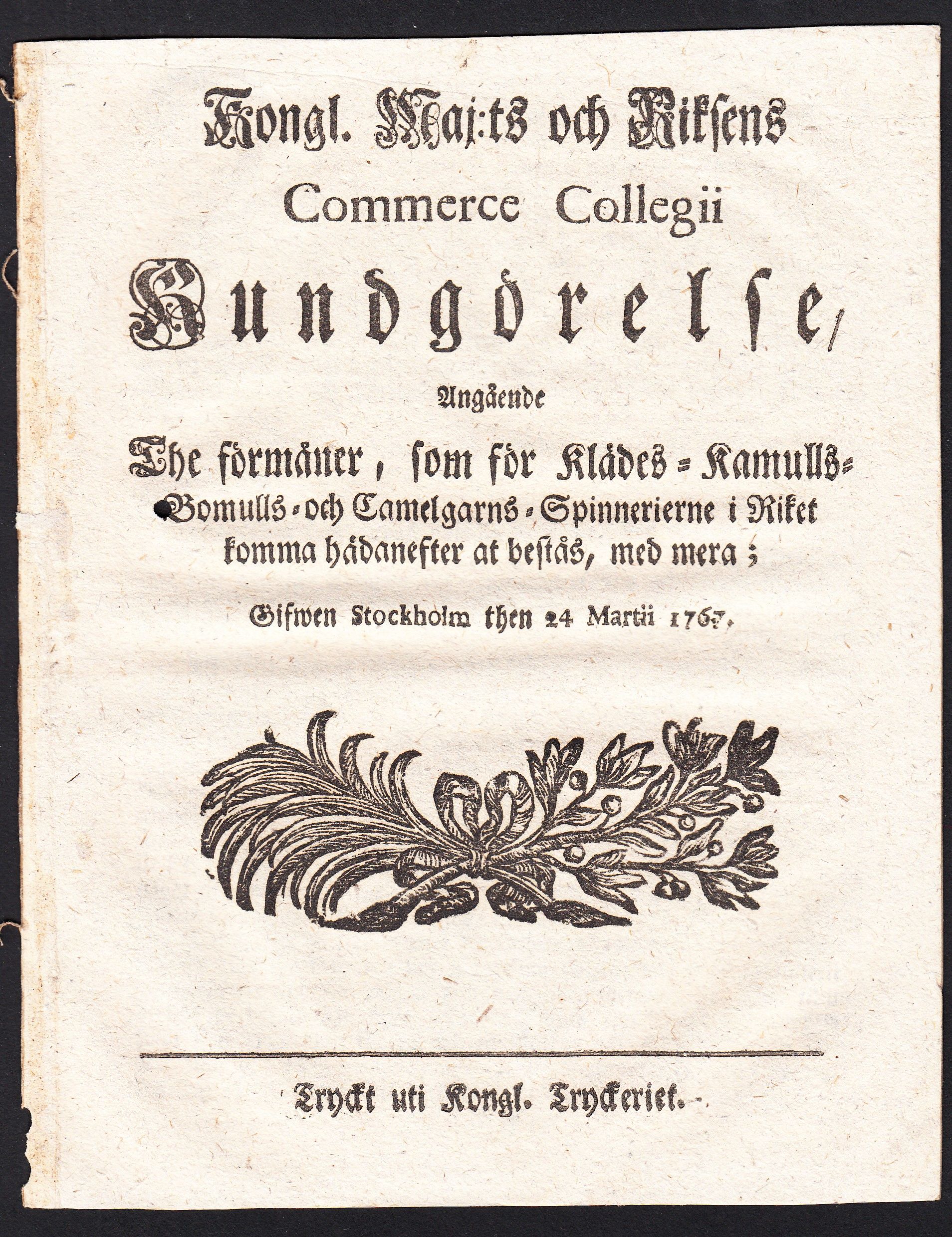 Kongl. Maj:ts och Riksens Commerce Collegii Kundgörelse, Angående The förmoner, som för Klädes- Kamulls- Bomulls- och Camelgarns-Spinnerierne i Riket komma hädanefter at bestås, med mera. Gifwen Stockholm then 24 martii 1767.