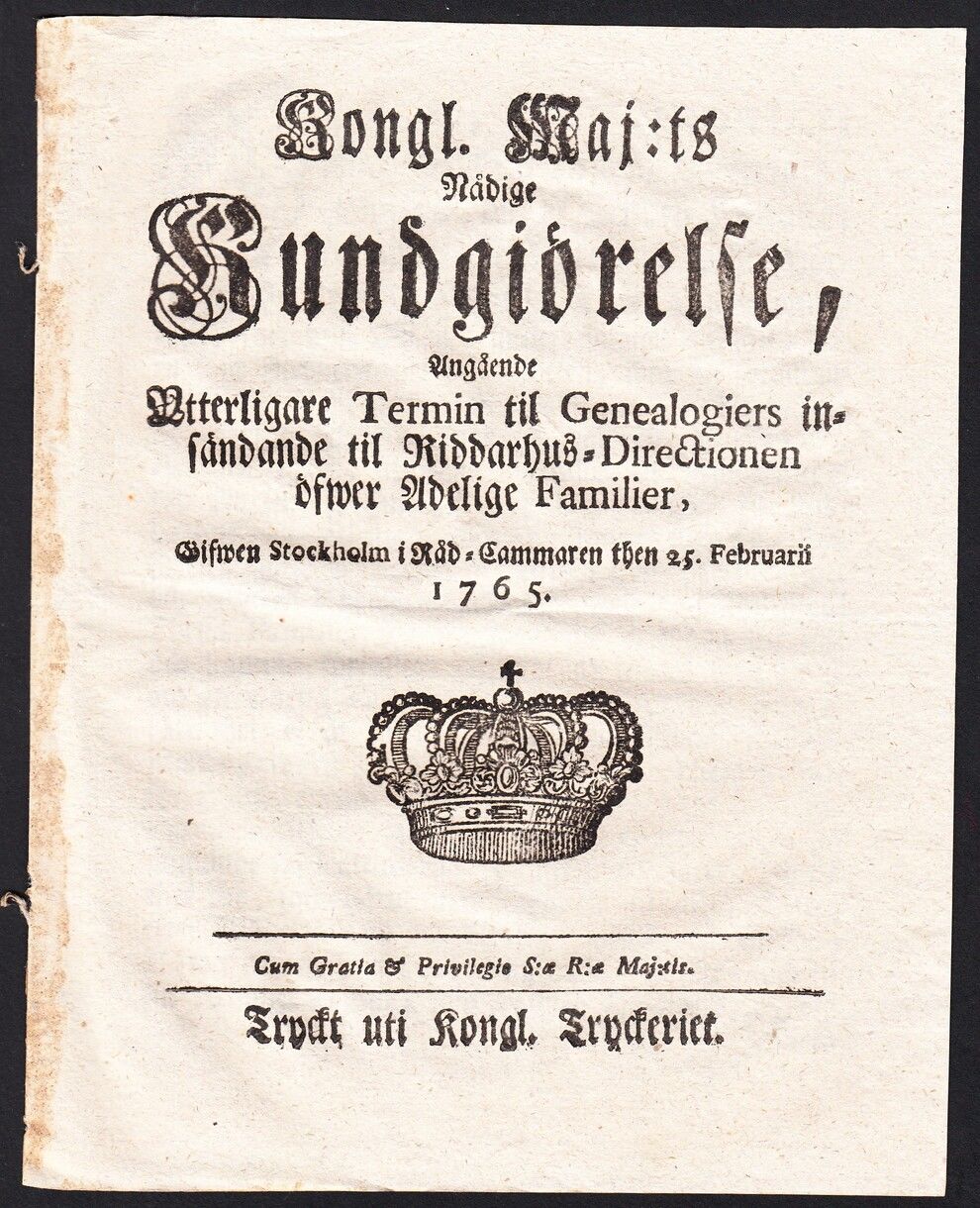 Kongl. maj:ts nådige Kundgiörelse, Angående Ytterligare Termin til Genealogiers insändande til Riddarhus-Directionen öfwer Adelige Familier, Gifwen Stockholm i Råd-Cammaren then 25. februarii 1765.
