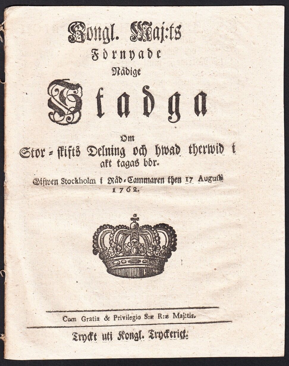 Kongl. Maj:ts Förnyade Nådige Stadga Om Stor-skifts Delning och hwad therwid i akt tagas bör. Gifwen Stockholm i Råd-Cammaren then 17 Augusti 1762.