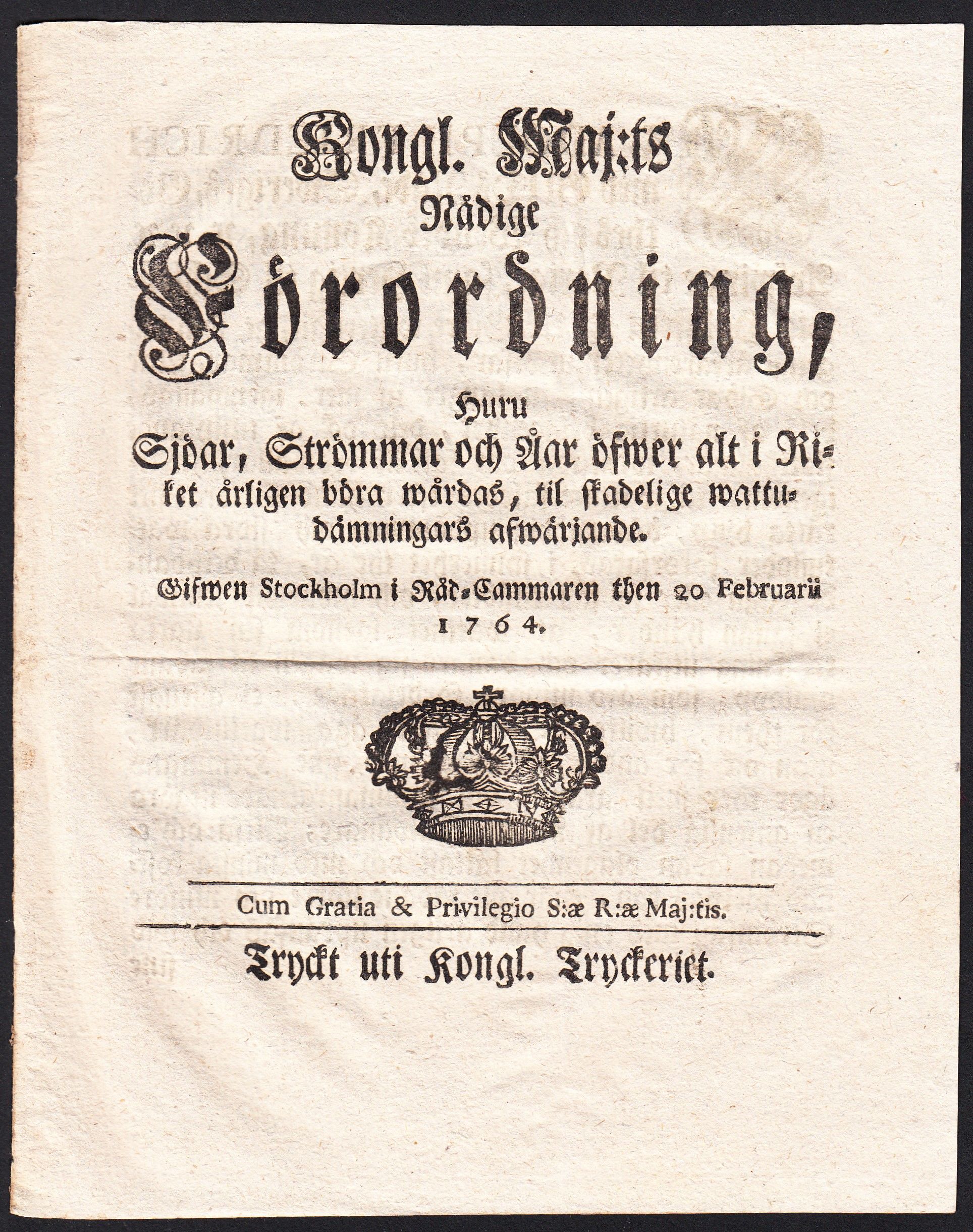 Kongl. maj:ts nådige Förordning, Huru Sjöar, Strömmar och Åar öfwer alt i Riket årligen böra wårdas, til skadelige wattudämningars afwärjande. Gifwen Stockholm i Råd-Cammaren then 20 februarii 1764.