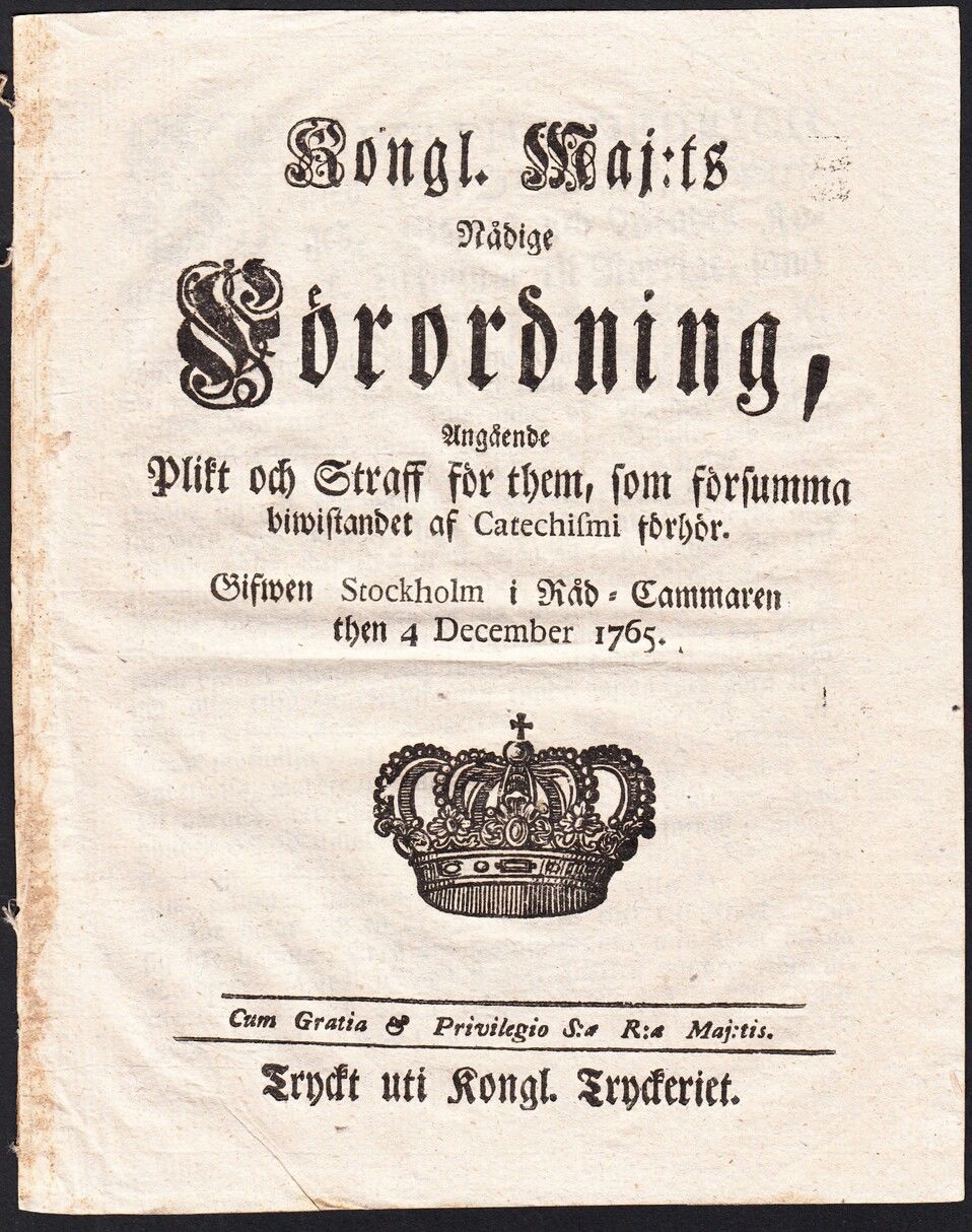 Kongl. maj:ts nådige Förordning, Angående Plikt och Straff för them, som försumma biwistande af Catechismi förhör. Gifwen Stockholm i Råd-Cammaren then 4 december 1765.