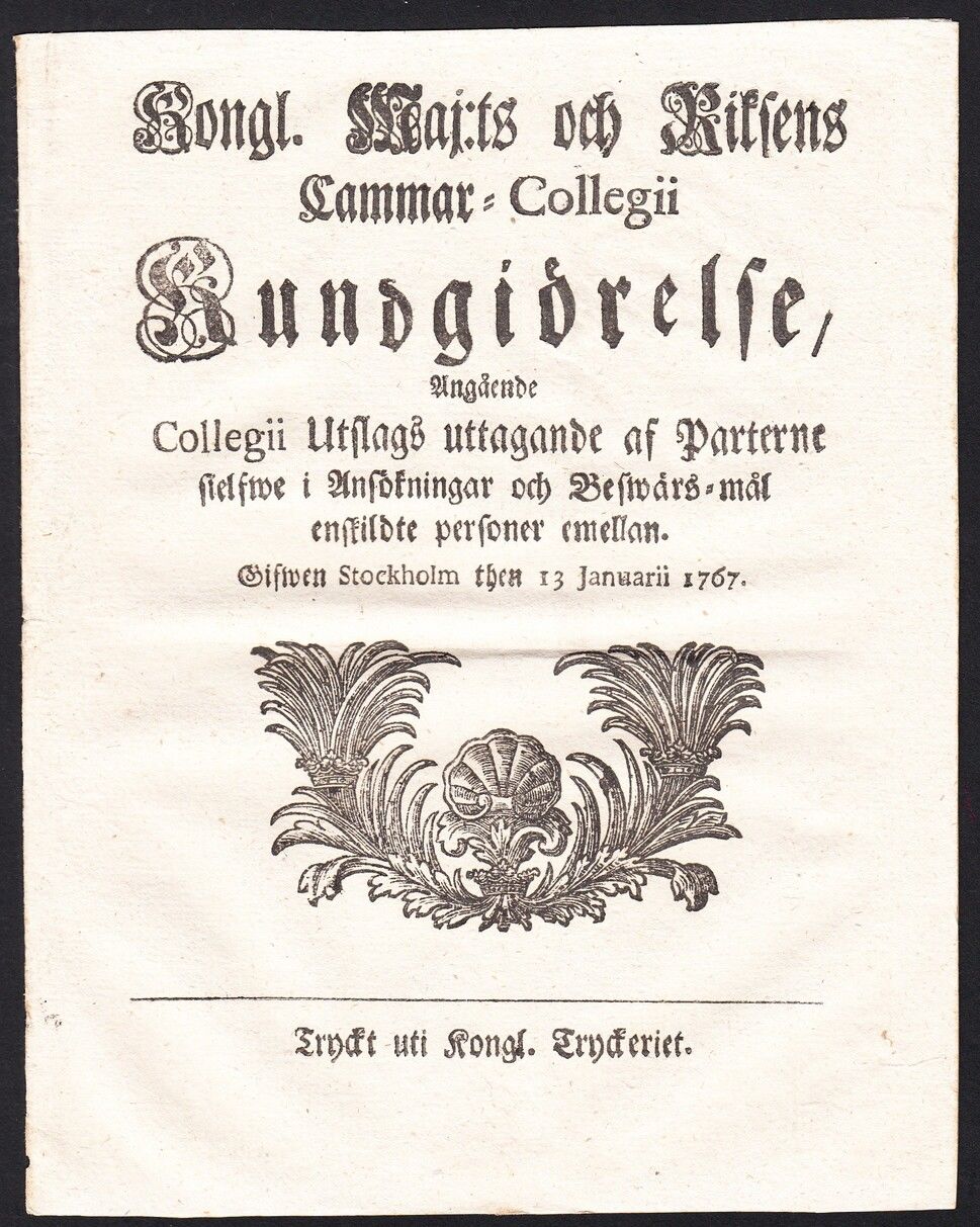 Kongl. Maj:ts och Riksens Cammar-Collegii Kundgiörelse, Angående Collegii Utslags uttagande af Parterne sielfwe i Ansökningar och Beswärs-mål enskildte personer emellan. Gifwen Stockholm then 13 Januarii 1767.