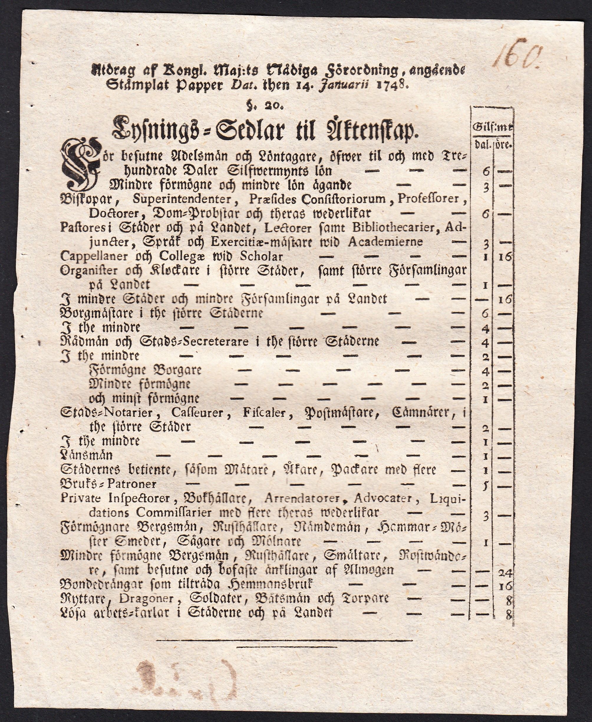Utdrag af Kongl. Maj:ts Nådiga Förordning, Angående Stämplat Papper Dat. then 14. januarii 1748. §20. Lysnings-Sedlar til Äktenskap [= rubrik].