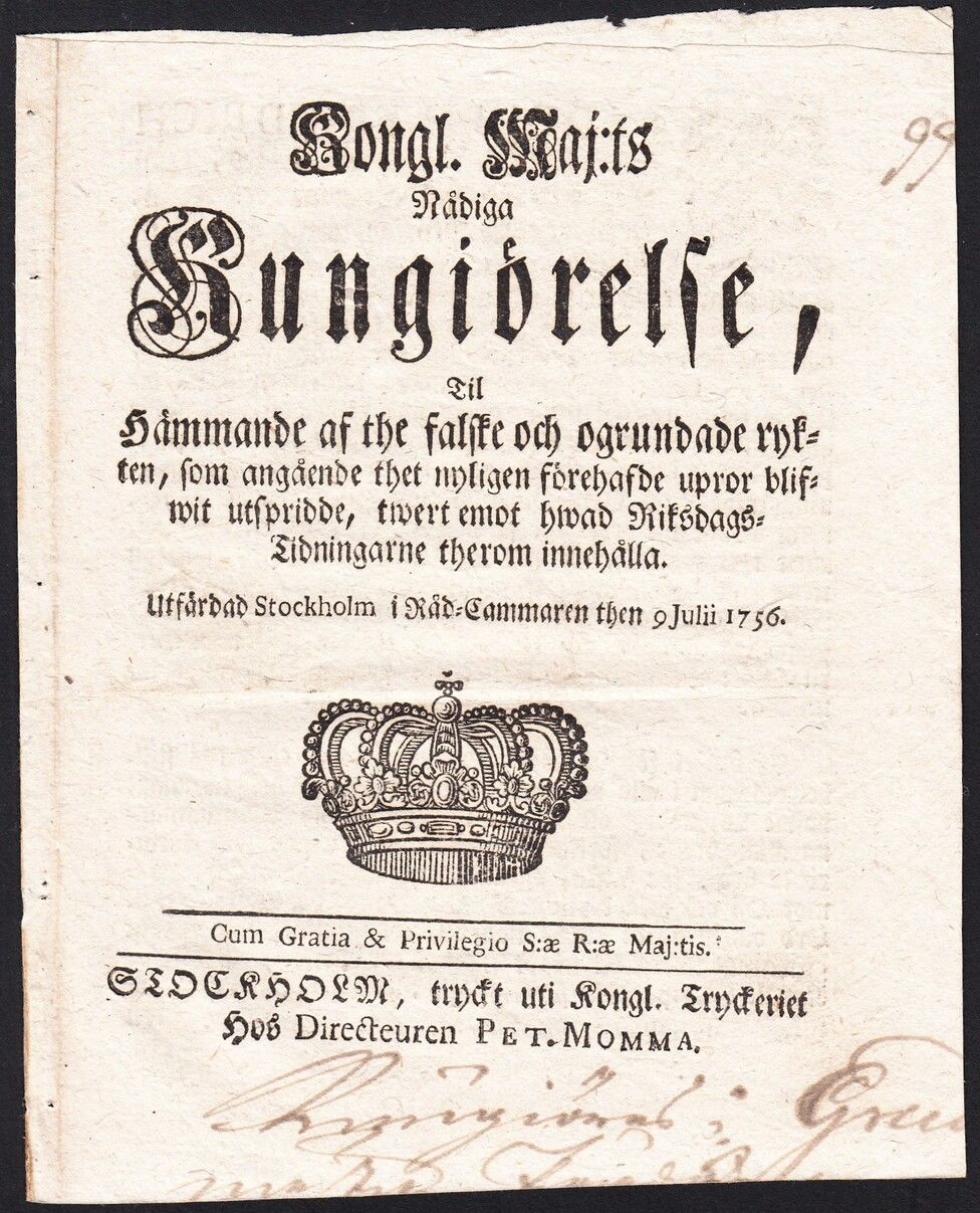 Kongl. Maj:ts Nådiga Kungiörelse, Til Hämmande af the falske och ogrundade rykten, som angående thet nyligen förehafde upror blifwit utspridde, twert emot hwad Riksdags-Tidningarne therom innehålla. Utfärdad Stockholm i Råd-Cammaren then 9 Julii 1756.
