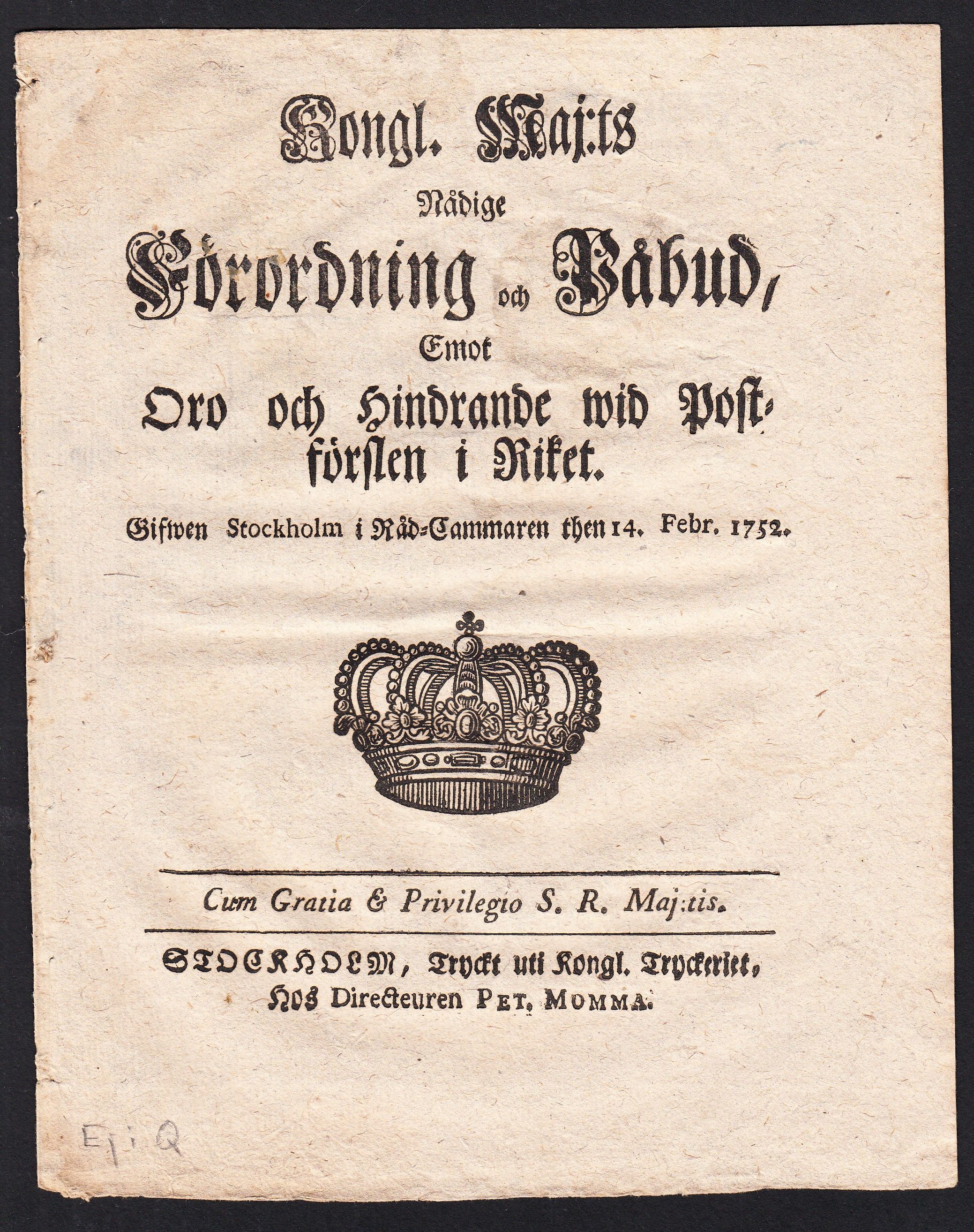 Kongl. maj:ts nådige Förordning och Påbud, Emot Oro och Hindrande wid Postförslen i Riket. Gifwen Stockholm i Råd-Cammaren then 14. febr. 1752.