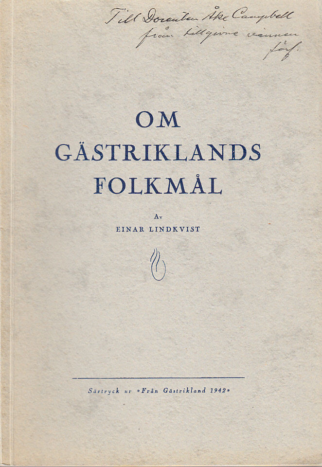 [Gävle & Uppsala, 1942]. Liten 4:o. s. [5]-102. Trådhäftad med styvt tryckt grått pappersomslag. Fint exemplar. Tilskrift ‘Till Docenten Åke Campbell från tillgivne vännen förf.’ på främre omslag.