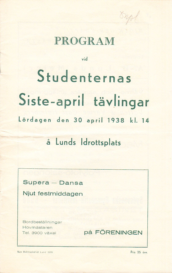 Program vid studenternas siste-april tävlingar. Lördagen den 30 april 1938 kl. 14 å Lunds Idrottsplats.