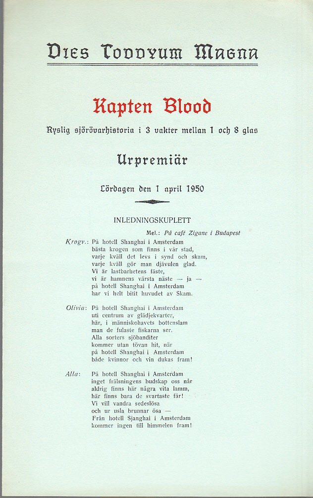 Kapten Blood. Ryslig sjörövarhistoria i 3 vakter mellan 1 och 8 glas. Urpremiär lördagen den 1 april 1950 [= rubrik].