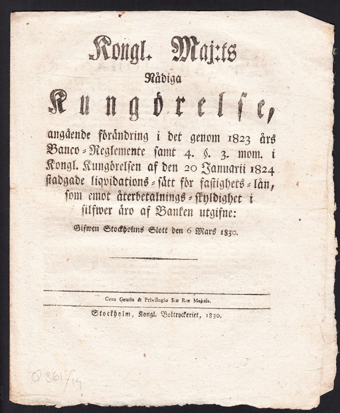 Kongl. maj:ts nådiga Kungörelse, angående förändring i det genom 1823 års Banco-Reglemente samt 4. §. 3. mom. i Kongl. Kungörelsen af den 20 Januarii 1824 stadgade liqvidations-sätt för fastighets-lån, som emot återbetalnings-skyldighet i silfwer äro af Banken utgifne: Gifwen Stockholms slott den 6 martii 1830.