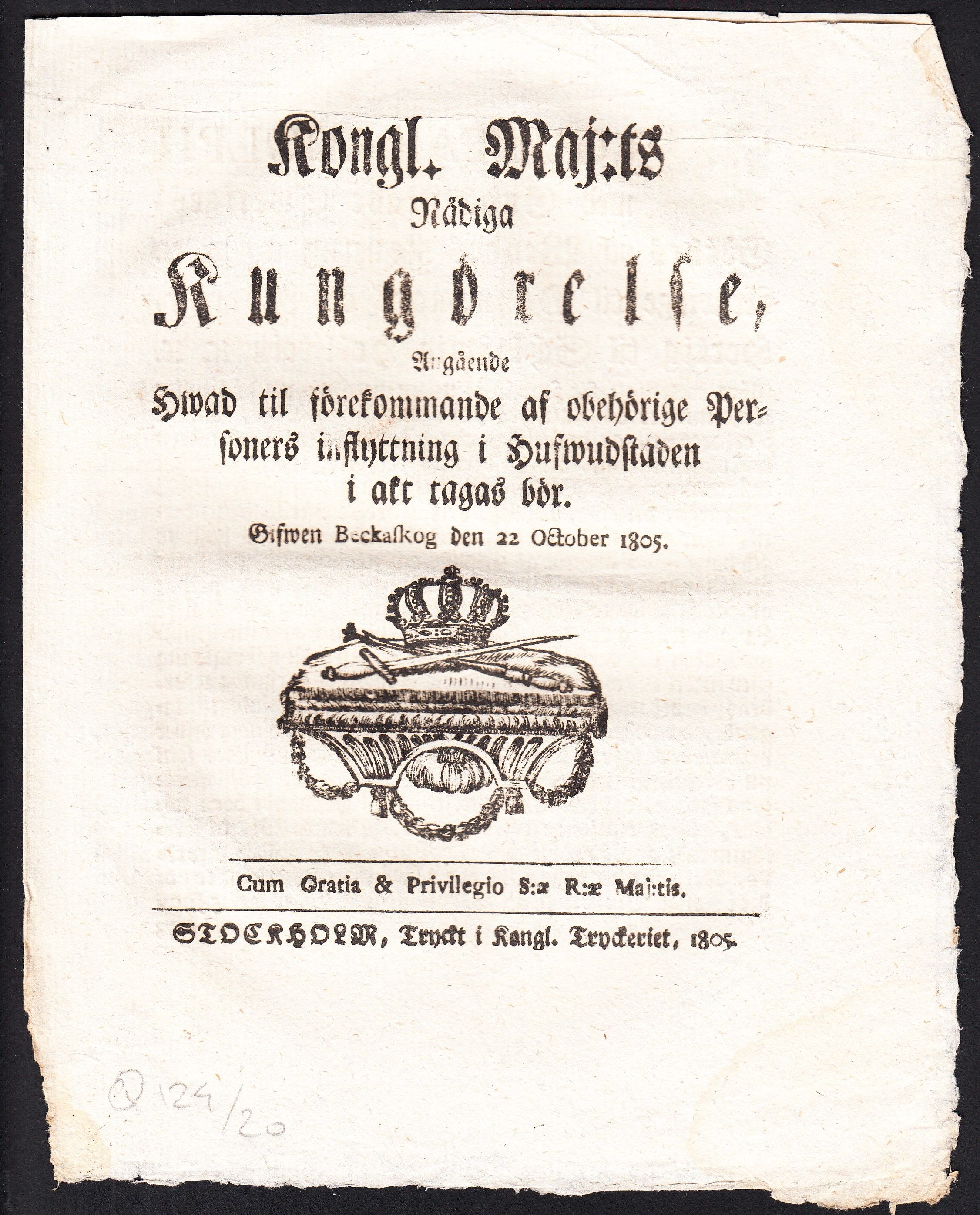Kongl. maj:ts nådiga Kungörelse, Angående Hwad til förekommande af obehörige Personers inflyttning i Hufwudstaden i akt tagas bör. Gifwen Beckaskog den 22 october 1805.
