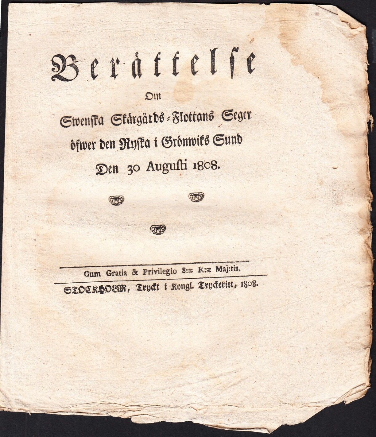 Berättelse om swenska skärgårds-flottans seger öfwer den ryska i Grönwiks sund den 30 augusti 1808.