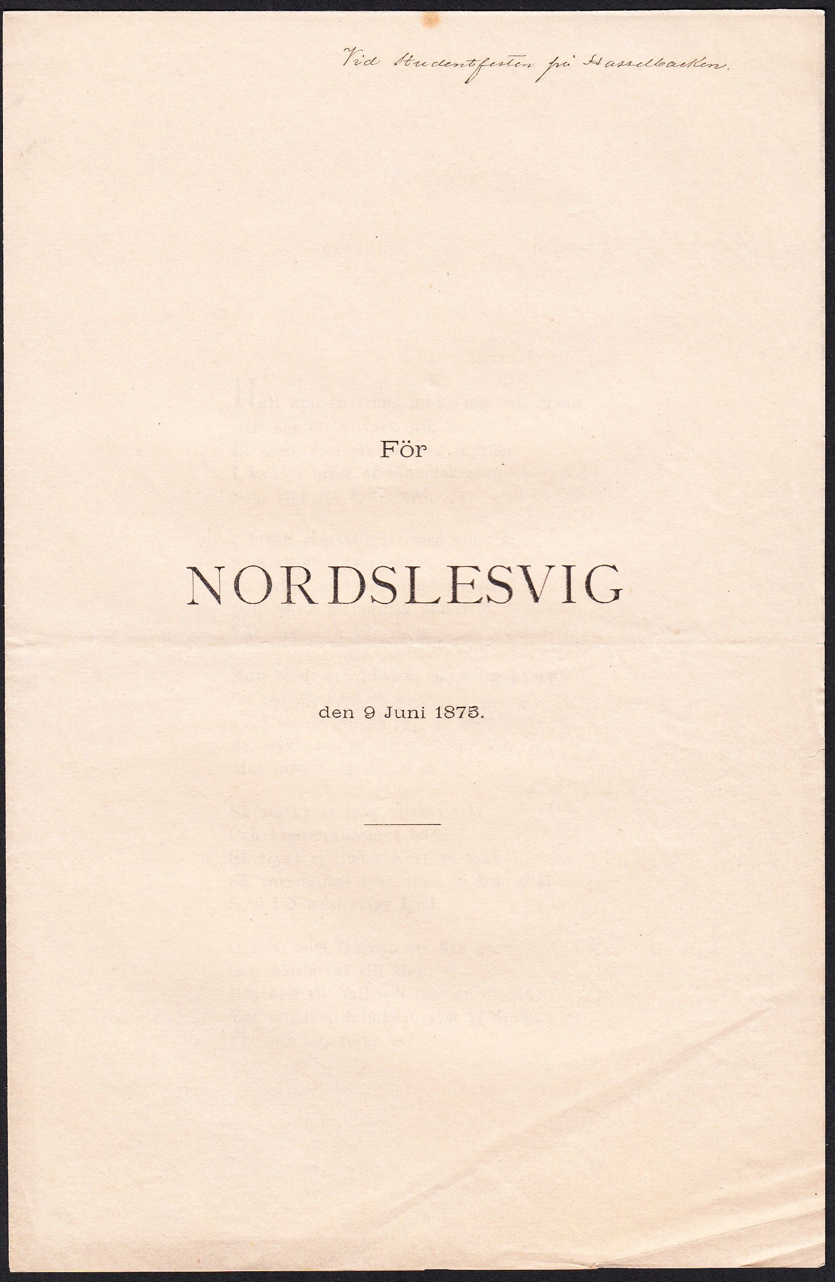 Stockholm, Aftonbladets Aktiebolag, 1875. 8:o. (4) s. Vikt ark. Nedre yttre hörn med vikmärke samt med antydan till tvärgående vikmärken. Notering ‘Vid studentfesten på Hasselbacken’ på titelbladets övre marginal.