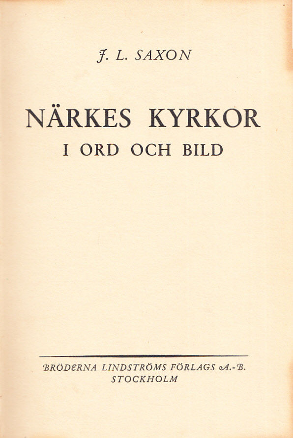 Närkes kyrkor i ord och bild av J. L. Saxon. [Utg. av] Bröderna Lindströms Förlag.
