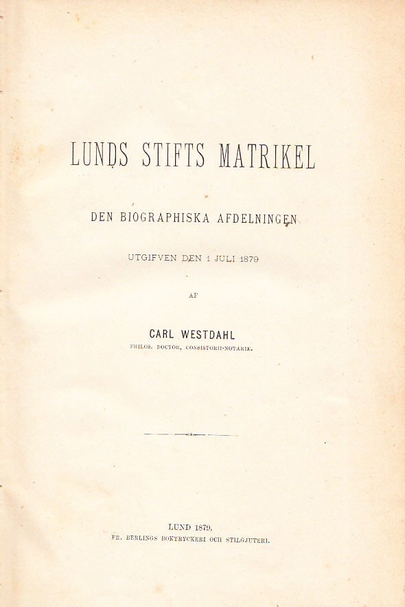 Lunds stifts Matrikel. Den biographiska afdelningen utgifven den 1 juli 1879 af Carl Westdahl.