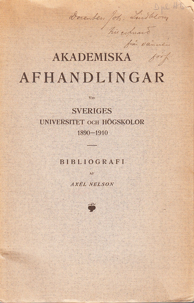 Akademiska afhandlingar vid Sveriges universitet och högskolor läsåren 1890/91-1909/10 jämte förteckning öfver svenskars akademiska afhandlingar vid utländska universitet under samma tid. Bibliografi af Axel Nelson.