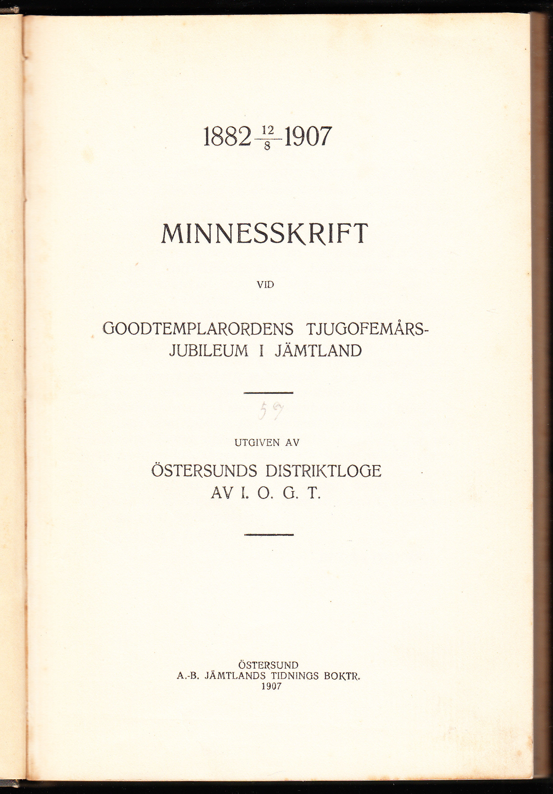 Minnesskrift vid Goodtemplarordens tjugofemårsjubileum i Jämtland. 1882 12/8 1907. Utgiven av Östersunds distriktloge av I.O.G.T.