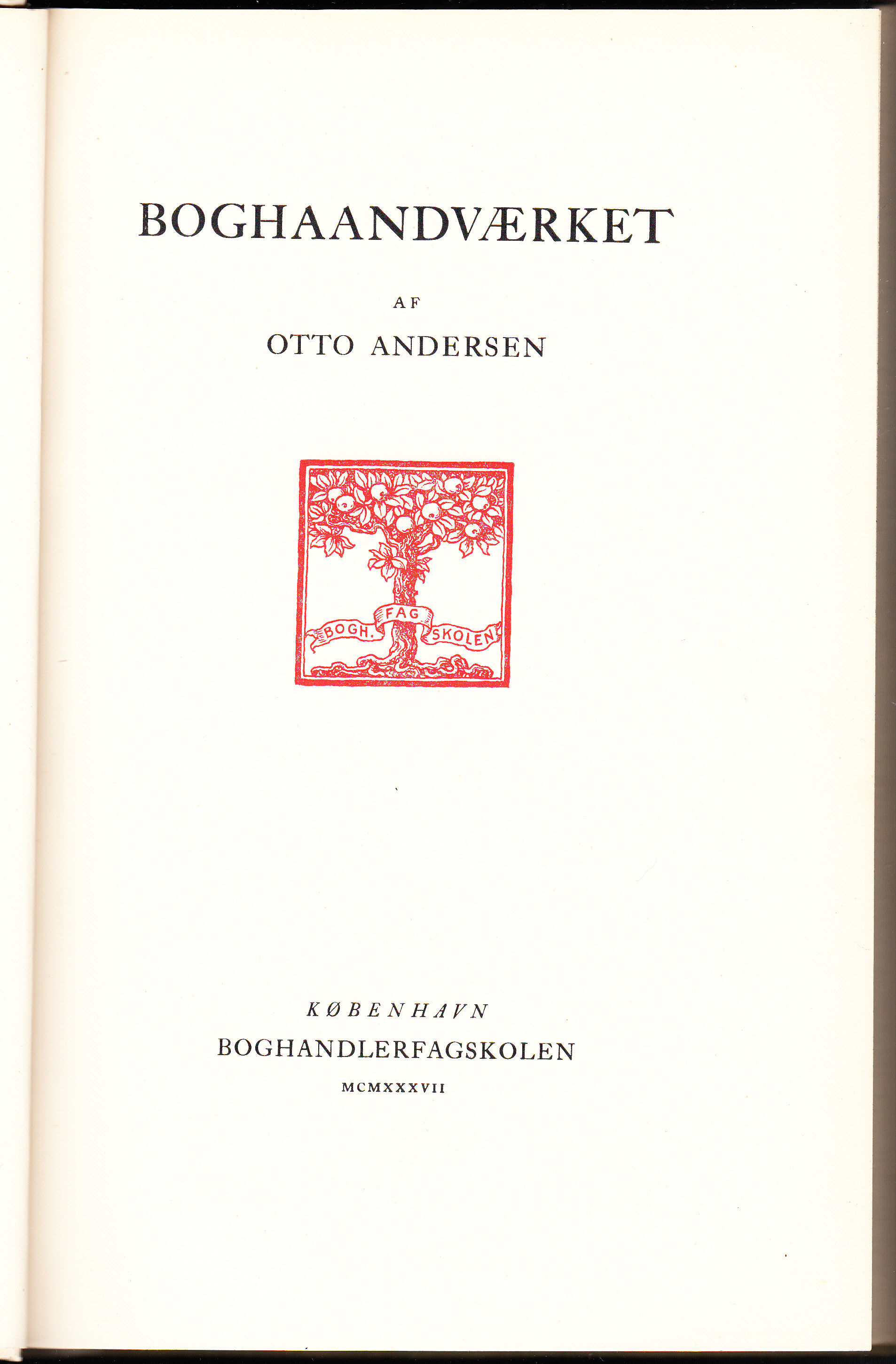 Första upplagan. Innehåll: Bogtrykk (Skriftarter; Skriftstørrelser; Typematerialet; Haandsætning; Maskinsætning; Korrekturlæsning; Trykning); Papir; Reproduktion (Højtryk; Dybtryk; Fladtryk); Bogbinderarbejdet (Haandindbinding; Maskinindbinding); Tilrettelæggelse (Bgens tilrettelæggelse; Reklametryksagens tilrettelæggelse; Annoncens tilrettelæggelse); Bogskrifternes historie; Tekniske oplysninger (Bogtryk; Sætning (Korrekturskema); Trykning; Papir; Reproduktion; Højtryk; Dybtryk; Fladtryck; Bogbinderarbejdet; Bindarter; Bindmaterialer); Annoncer med satsprøver; Emneregister; Bilag.