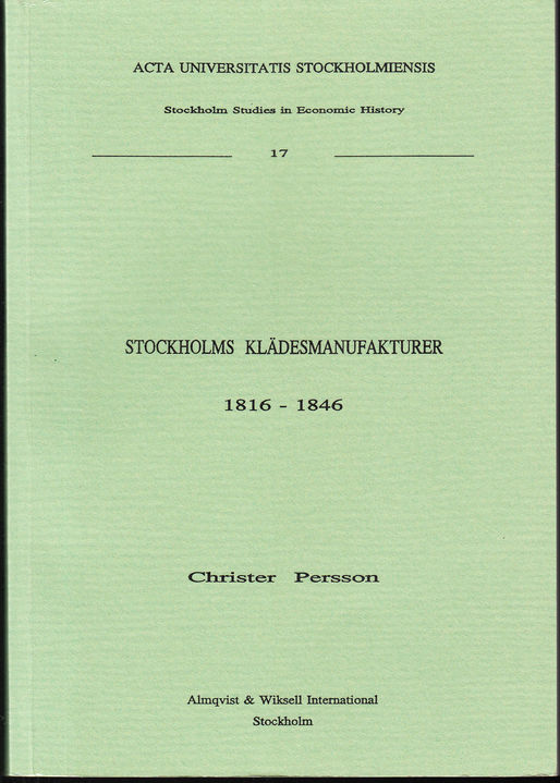 Stockholm studies in economic history 17. Akademisk avhandling. Innehåll: Tabeller och diagram; Förord; Inledning; Hallrättsmaterialet; Stockholms demografiska och sociala utveckling 1760-1850; Stockholms manufakturindustri 1755-1846; Stockholms klädesmanufakturer 1816-1846; Klädesmanufakturens utvecklingsvillkor; Summary; Tabellbilagor; Klädesfabrikörer i Stockholm 1816-1845; Källor och litteratur.