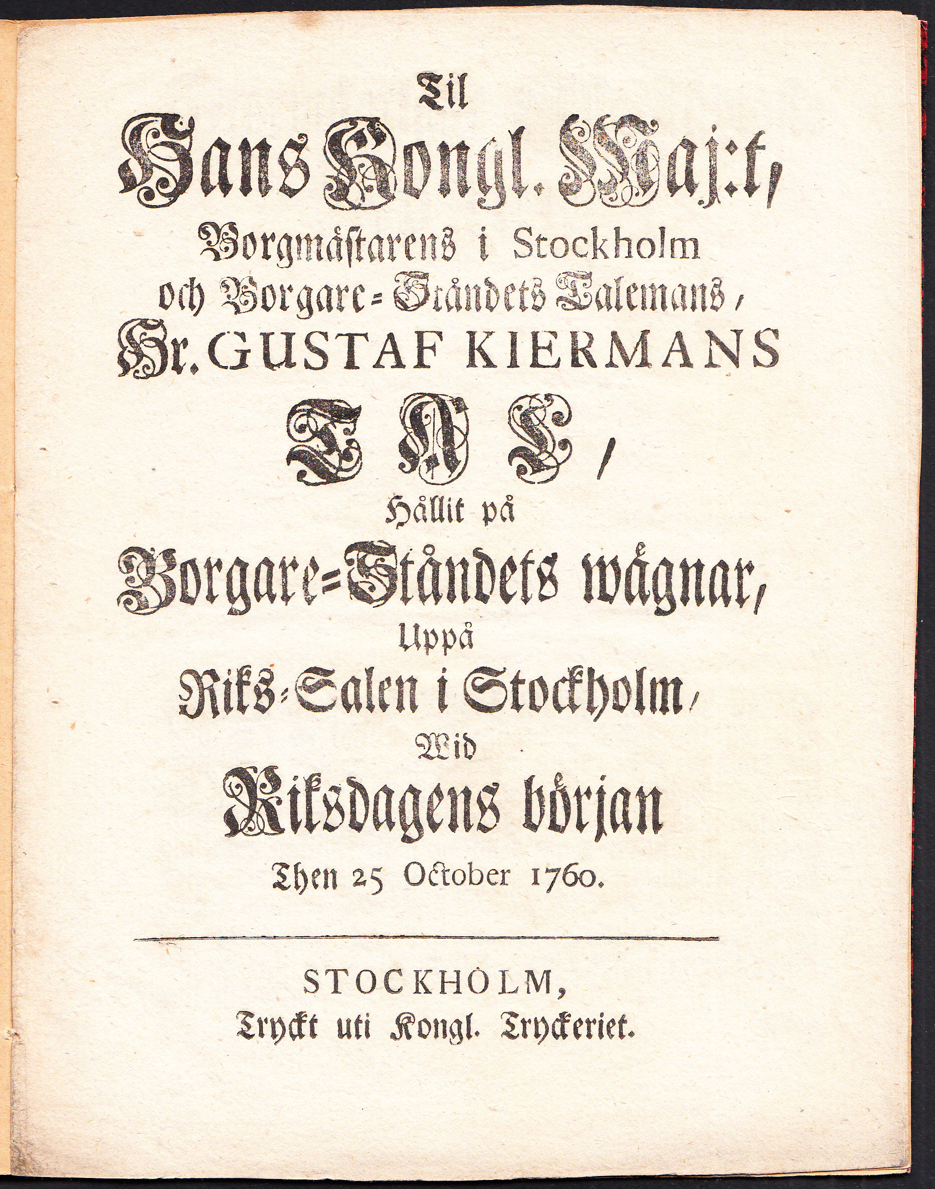 Til hans kongl. maj:t, borgmästarens i Stockholm och borgare-ståndets talemans, hr. Gustaf Kiermans tal, hållit på borgare-ståndets wägnar, uppå riks-salen i Stockholm, wid riksdagens början then 25 october 1760.