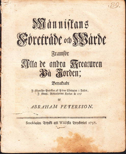 Människans företräde och wärde framför alla de andra kreaturen på jorden; betraktadt i högmäszo-predikan på andra söndagen i faston, i kongl. Riddarholms kyrkan år 1757 af Abraham Petersson.