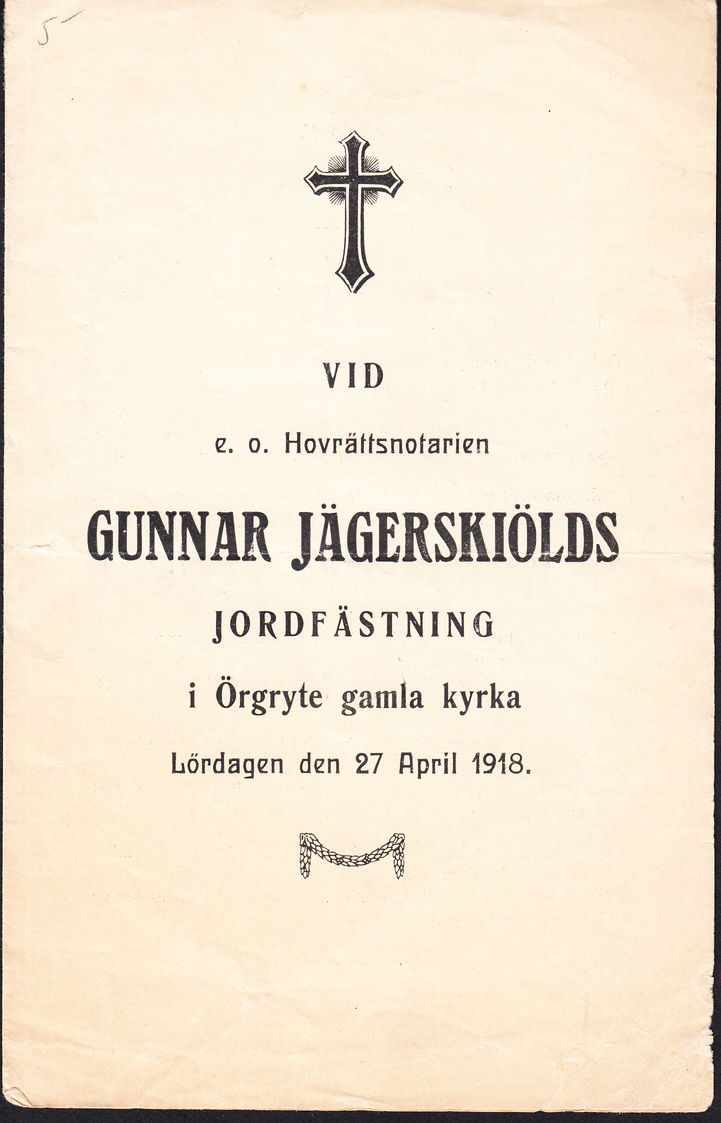 Vid e.o. Hovrättsnotarien Gunnar Jägerskiölds jordfästning i Örgryte gamla kyrka lördagen den 27 april 1918.