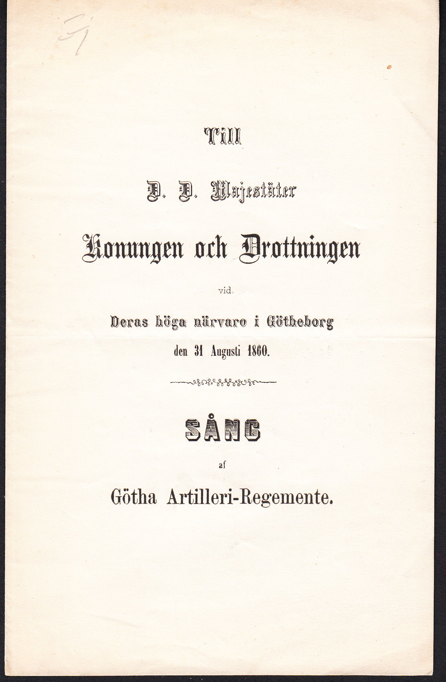 Till d. d. majestäter konungen och drottningen vid deras höga närvaro i Götheborg den 31 augusti 1860. Sång af Götha Artilleri-Regemente.