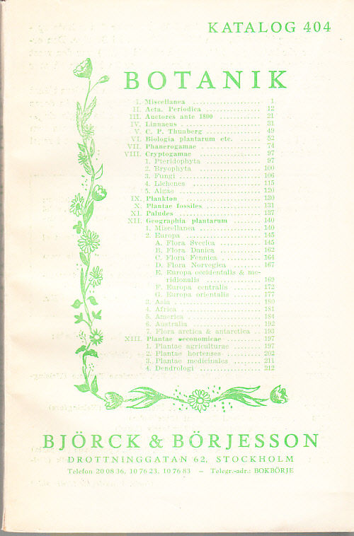 Omfattar 5637 nummer. Innehåll: Allmän botanik (Miscellanea); Tidskrifter (Acta. Periodica); Gammal botanik (Auctores ante 1800); Carl v. Linné (Linnaeus); C.P. Thunberg; Växternas biologi etc. (Biologia plantarum etc.); Phanerogamae; Cryptogamae; Plankton; Fossila växter (Plantae fossiles); Mossar. Myrar. Kärr (Paludes); Växtgeografi (Geographia plantarum); Gagnväxter (Plantae oeconomicae).
